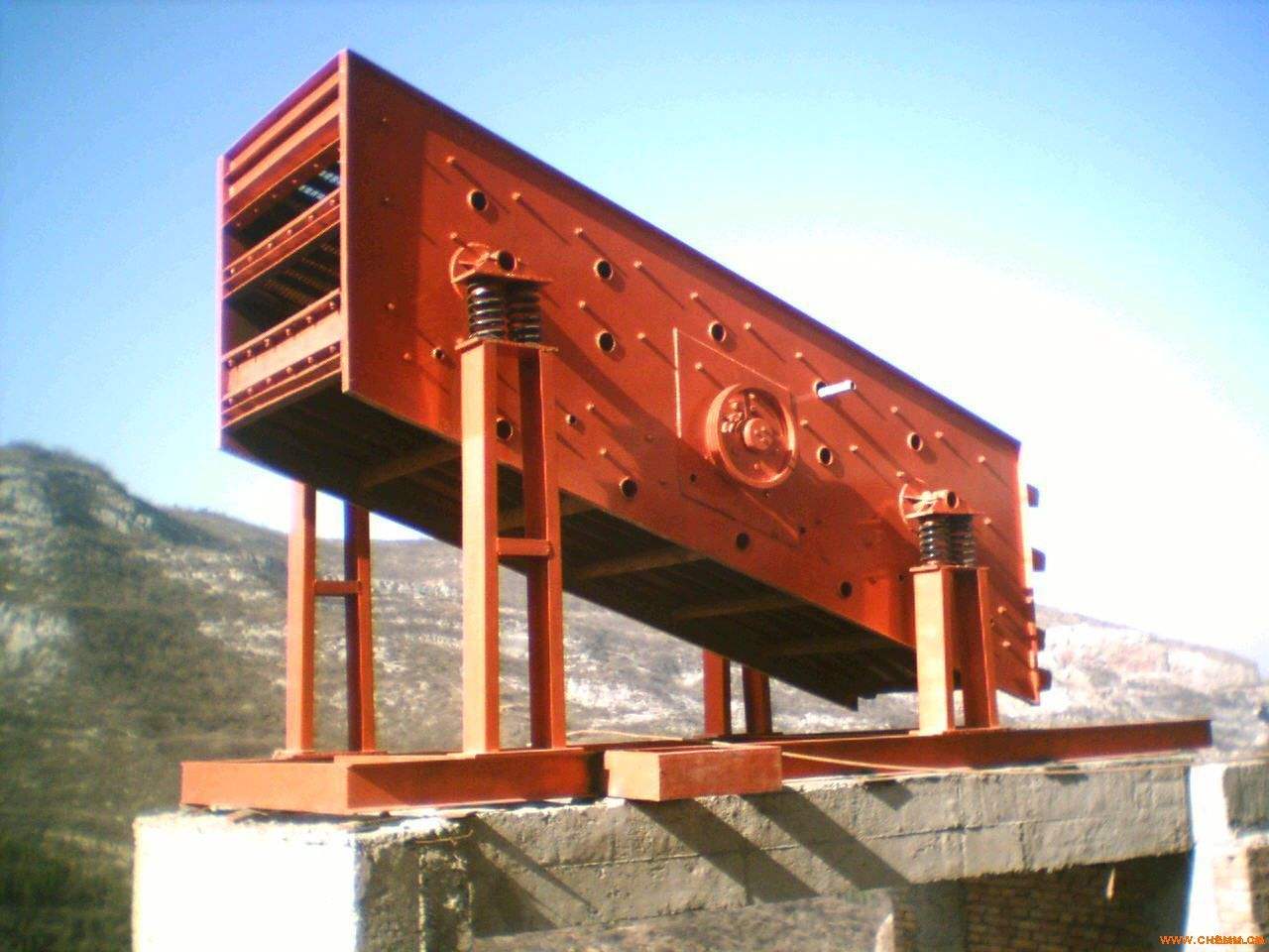 直線振動(dòng)篩由機(jī) 座、參振兩部份組成,振動(dòng)電機(jī)安裝在直線篩的長方形篩架兩側(cè),通過彈性橡膠連接產(chǎn)生振動(dòng),調(diào)節(jié)振動(dòng)電機(jī)內(nèi)和重塊相位角,可以提高振幅和激 振力,所以,直線篩可以單層或多層使用。